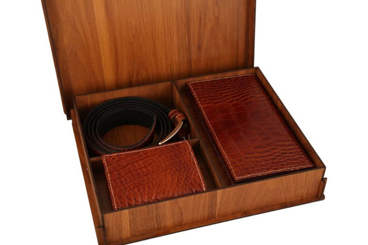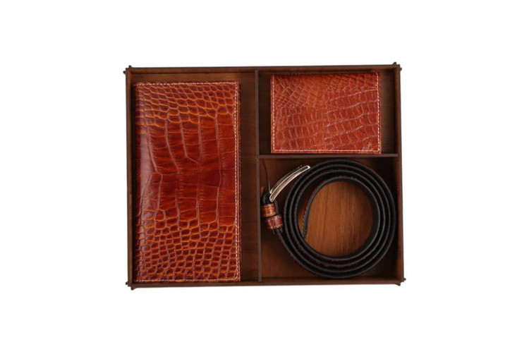 ست سه تیکه دارای کیف کتی کمربند و جاکارتی همگی چرم گاوی کروکو کیف کتی پرکار کمربند چرم قلاب زبانه دار ترک